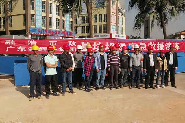 2019年11月21日(星期四)早上9:30,廣東金輝華集團公司承建的江門市供水管網擴容改造建設項目勘察設計施工總承包工程,在江門市蓬江區奇榜片區五邑機電城旁施工現場,進行”基坑坍塌應急救援演練”活動。演練的目的:1、評估安全事故的應急預案的響應啟動執行力和響應及時性,分析預案內容的針對性和真實性;2、檢驗應急響應人員對應急預案的了解及實際操作熟悉能力,對應急物資的使用熟悉程度,評估應急知識培訓的