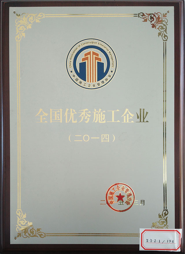 熱烈慶祝我公司榮獲全國優秀施工企業