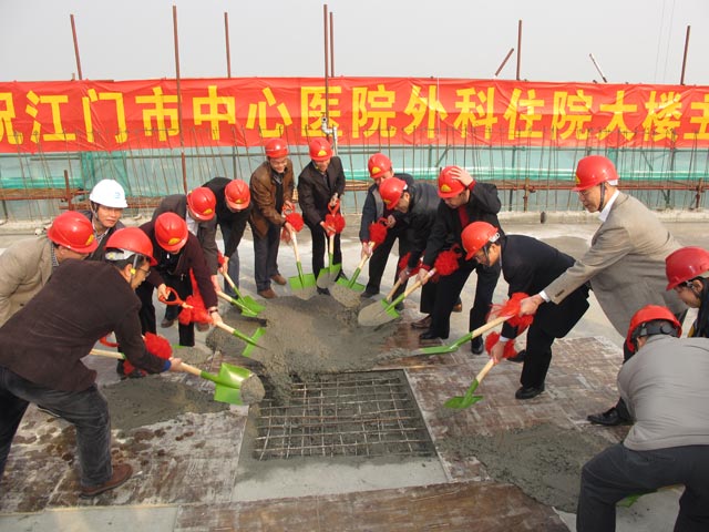 2014年1月6日上午11時,江門中心醫(yī)院外科住院大樓工程舉行封頂儀式,江門市衛(wèi)生局宋華局長、江門中心醫(yī)院梁伯進院長、我集團公司領(lǐng)導(dǎo)張國球、李甫、盧文權(quán)、張國勝出席了封頂儀式。江門市衛(wèi)生局宋華局長在工程現(xiàn)場會議室首先聽取了江門中心醫(yī)院外科住院大樓功能介紹和施工單位廣東金輝華集團有限公司對目前工程進度的簡單匯報,該工程地下2層,地上26層,建筑面積6.4萬平方米。隨后在江門中心醫(yī)院領(lǐng)導(dǎo)和施工單位負責(zé)