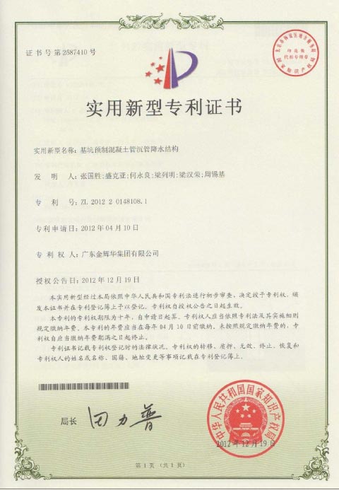 熱烈慶祝我公司專利“基坑預(yù)制混凝土管沉管降水結(jié)構(gòu)”獲得授權(quán)。