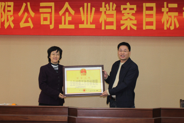 2010年12月24日上午“廣東金輝華集團有限公司企業(yè)檔案目標管理國家二級認定會”在集團技術中心會議室舉行,我司最終以88.2分的高分通過了企業(yè)檔案目標管理國家二級認定。圖為:我司接受企業(yè)檔案工作目標管理二級牌匾與會人員有江門市檔案局副局長...