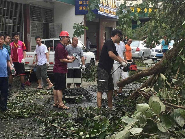 2017年8月23日中午12點50分,第13號臺風“天鴿”正面襲擊珠海市,大批樹木被攔腰折斷或連根拔起,造成大部分主干道堵塞,嚴重影響當?shù)鼐用窆ぷ骱蜕睢!疤鞛?zāi)無情人有情”,我集團珠海公司在獲悉災(zāi)情后,迅速行動,組織人員和車輛,全力以赴針對突出的受阻道路進行清理工作。在安平路、桃園路、海虹路、東風路等路段,隨處可見殘樹斷枝錯亂橫陳,珠海公司員工與當?shù)鼐用褚黄鹎鍜呃嵋茦淠尽V钡皆撀范吻逭瞎ぷ魍瓿桑缆方煌ɑ净謴?fù)。