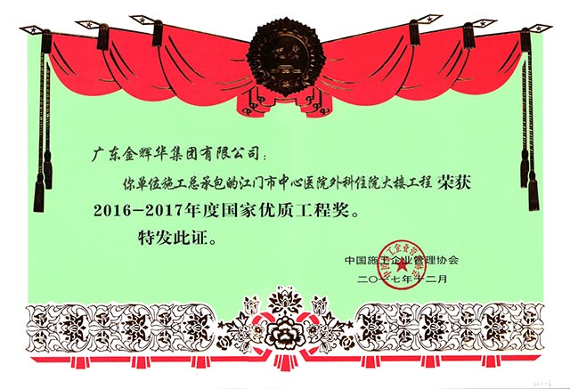 2017年 12月13日,由中國施工企業管理協會主辦的“2016-2017年度國家優質工程獎總結表彰大會”在北京人民大會堂舉行。廣東金輝華集團有限公司“江門市中心醫院外科住院大樓工程”和“臺山新寧體育館及人防工程”,榮獲國家優質工程獎兩項。