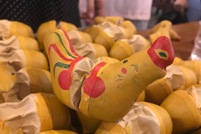 開平市水口鎮(zhèn)聯(lián)竹鄉(xiāng)制作鎮(zhèn)濠泥雞玩具已有二百多年歷史,以前每到農(nóng)歷春節(jié)前夕,來(lái)自鶴山、臺(tái)山、恩平、新會(huì)等地的商販們便駕車來(lái)采購(gòu)泥雞作年貨銷售。泥雞外形古樸、價(jià)格便宜,深受人們的喜愛。大年初一是雞日,大量泥雞上市,一時(shí)泥雞啼聲四起,給人們帶來(lái)歡欣和喜氣。
